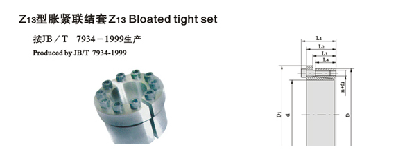 特性:Z13型脹緊套內外錐環用內六角螺栓擰緊,結合面較長,且對中性好,適用于旋轉精度要求較高和傳遞較大載荷的場合。